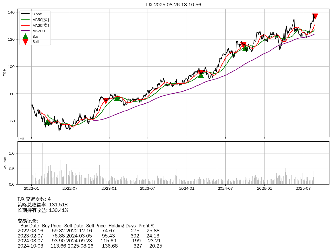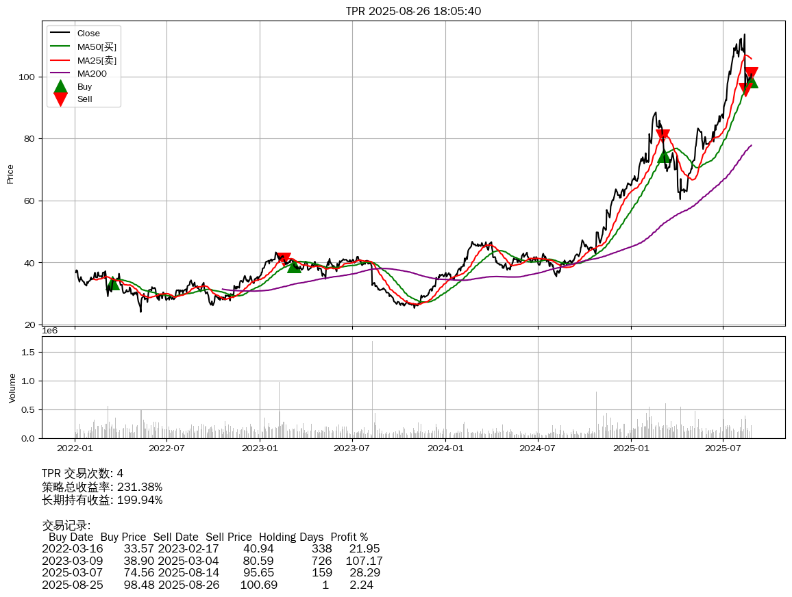 | TPR | 2025-08-26 | 涨破 MA50 均线 (100.69 > 99.18) |