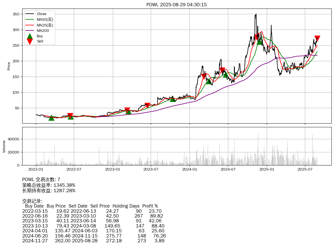 | 4 | POWL | +1345.38% | +1287.28% | +58.09% | 7 | 2022-01-03~2025-08-28 |