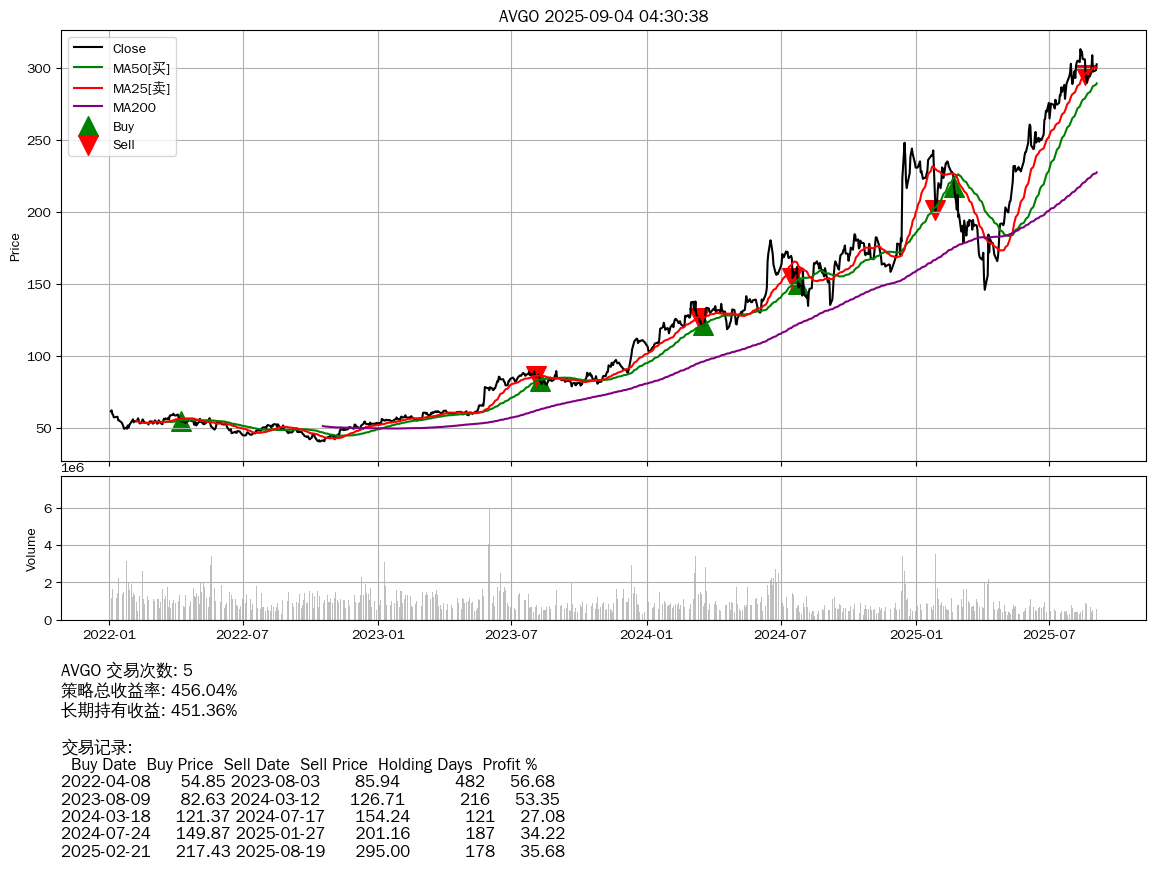 | 2 | AVGO | +456.04% | +458.07% | -2.03% | 5 | 2022-01-03~2025-09-04 |