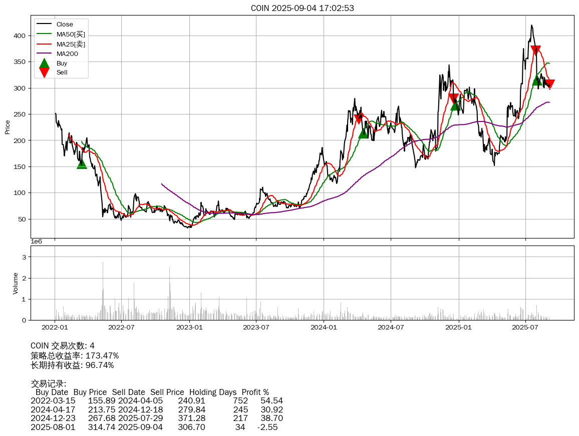| 9 | COIN | +173.47% | +96.74% | +76.73% | 4 | 2022-01-03~2025-09-04 |
