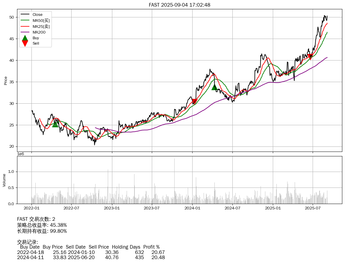 | 30 | FAST | +45.38% | +99.80% | -54.42% | 2 | 2022-01-03~2025-09-04 |