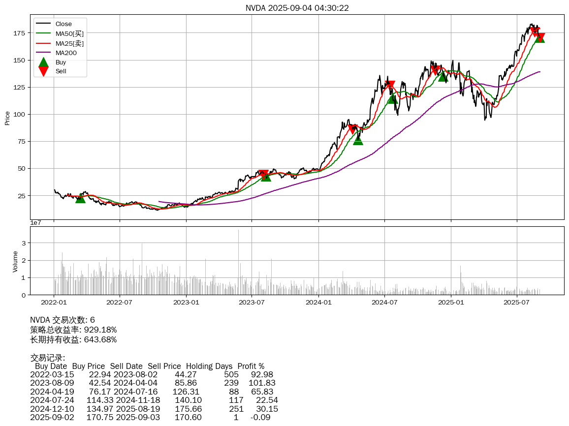 | 1 | NVDA | +935.57% | +648.30% | +287.27% | 6 | 2022-01-03~2025-09-04 |