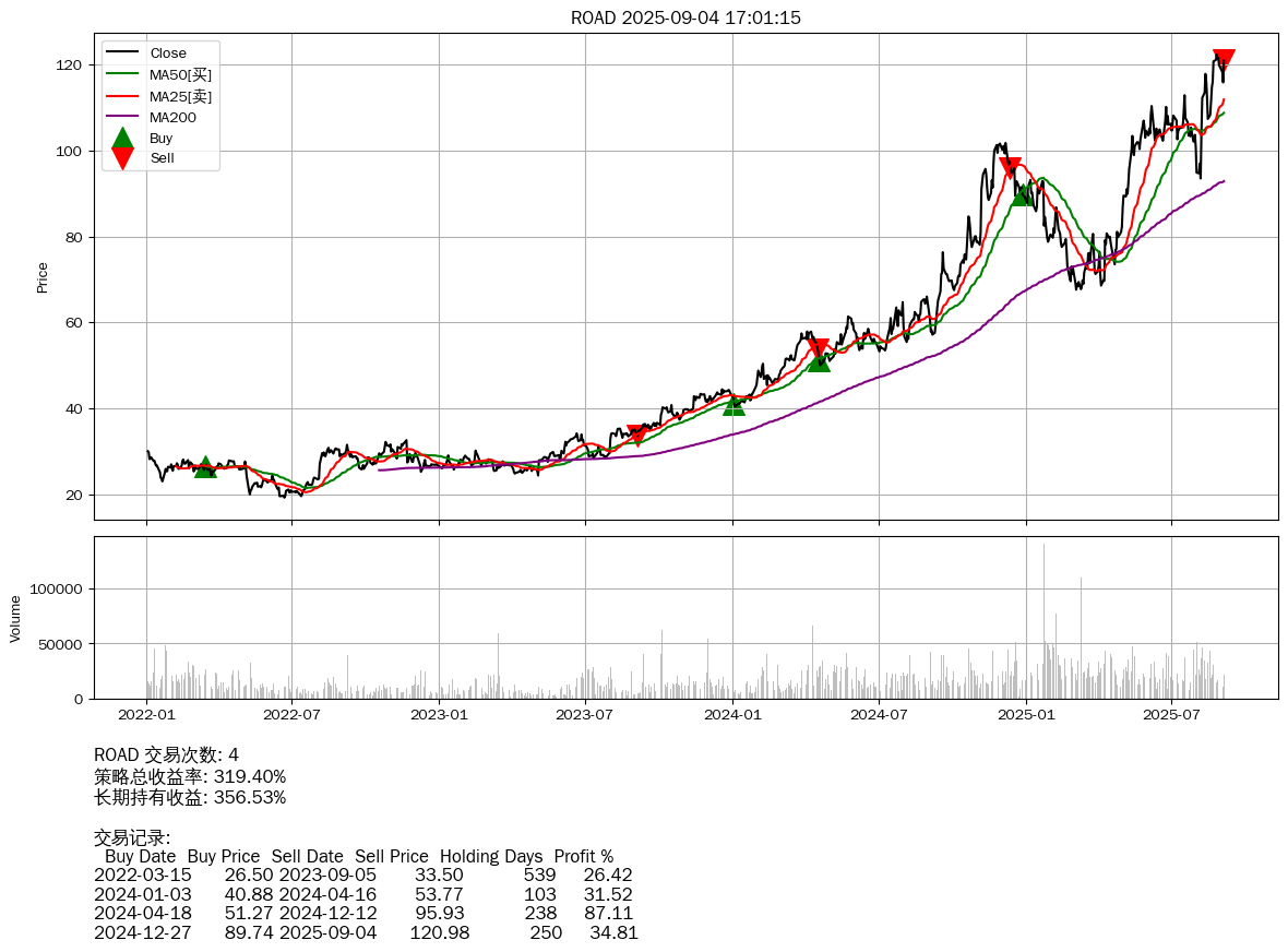 | 7 | ROAD | +319.40% | +356.53% | -37.13% | 4 | 2022-01-03~2025-09-04 |