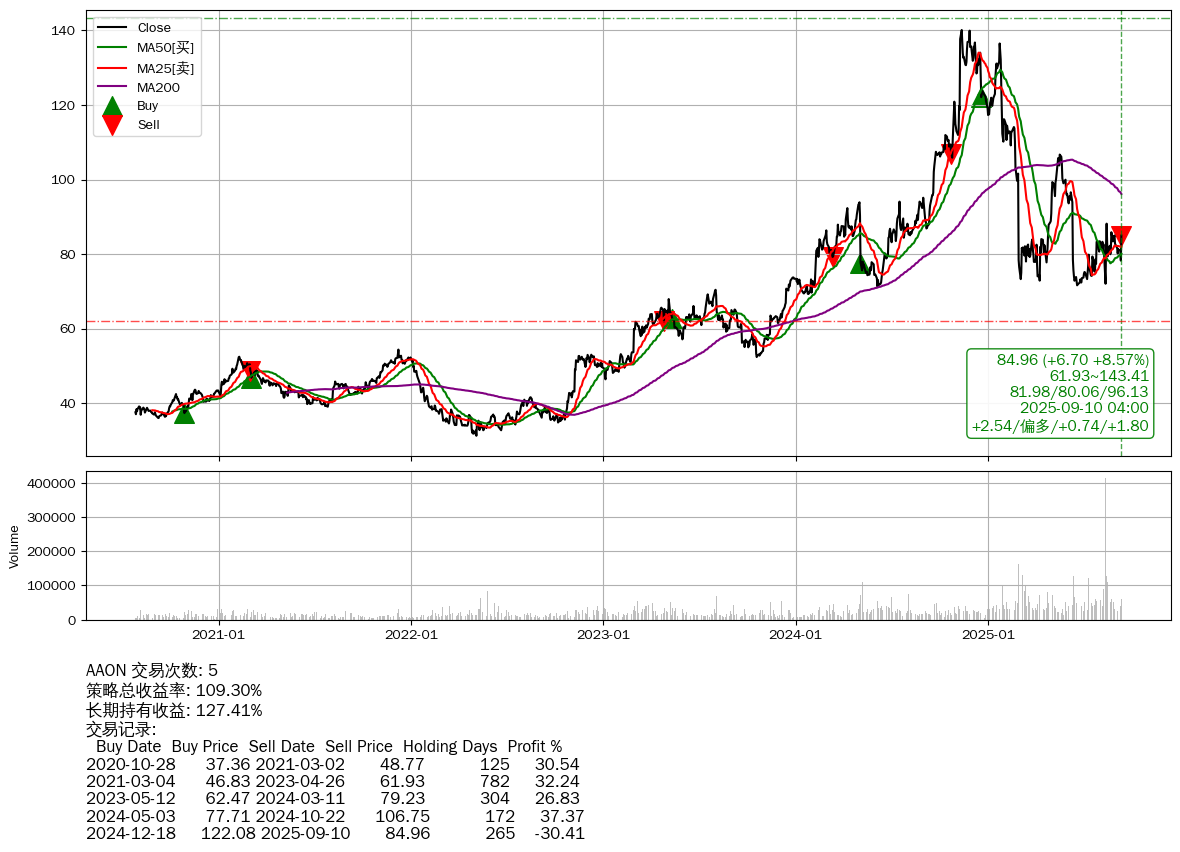 | 44 | AAON | +109.30% | +127.41% | -18.11% | 5 | +2.54/偏多/+0.74/+1.80 | 2020-07-27~2025-09-10 |