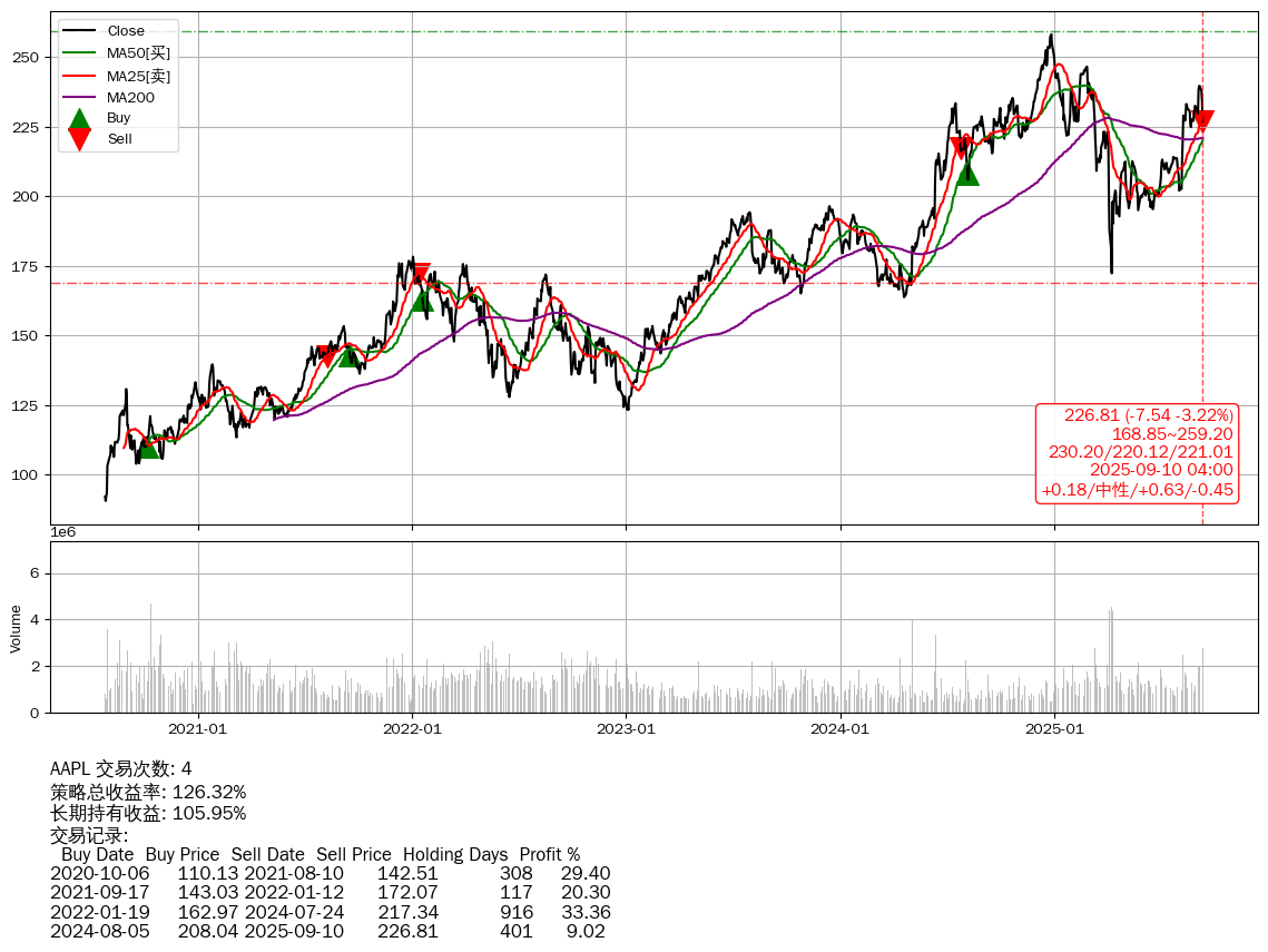 | 35 | ★AAPL | +126.32% | +105.95% | +20.38% | 4 | +0.18/中性/+0.63/-0.45 | 2020-07-27~2025-09-10 |
