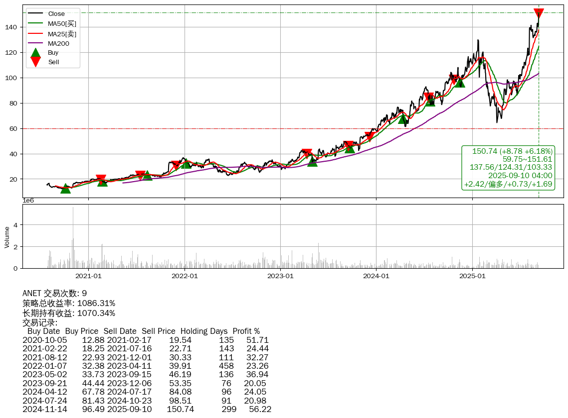 | 4 | ★ANET | +1086.31% | +1070.34% | +15.97% | 9 | +2.42/偏多/+0.73/+1.69 | 2020-07-27~2025-09-10 |