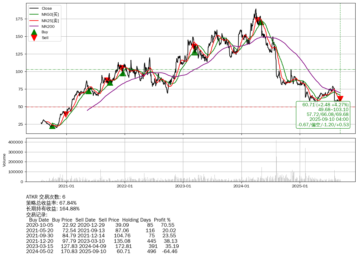 | 68 | ATKR | +67.84% | +164.88% | -97.04% | 6 | -0.67/偏空/-1.20/+0.53 | 2020-07-27~2025-09-10 |