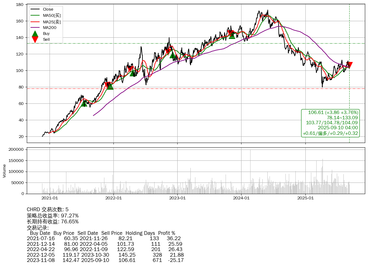 | 53 | CHRD | +97.27% | +76.65% | +20.61% | 5 | +0.61/偏多/+0.29/+0.32 | 2020-11-20~2025-09-10 |