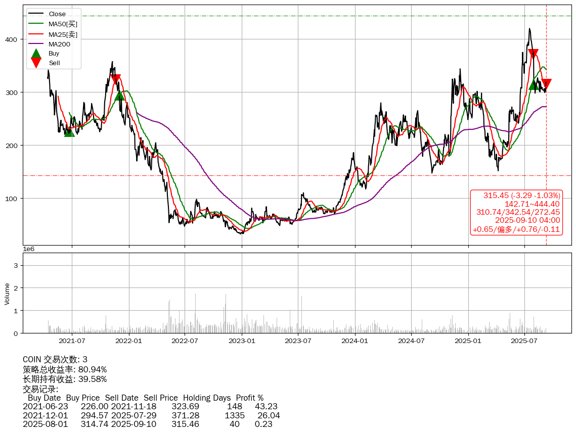 | 61 | COIN | +80.94% | +39.58% | +41.36% | 3 | +0.65/偏多/+0.76/-0.11 | 2021-04-14~2025-09-10 |