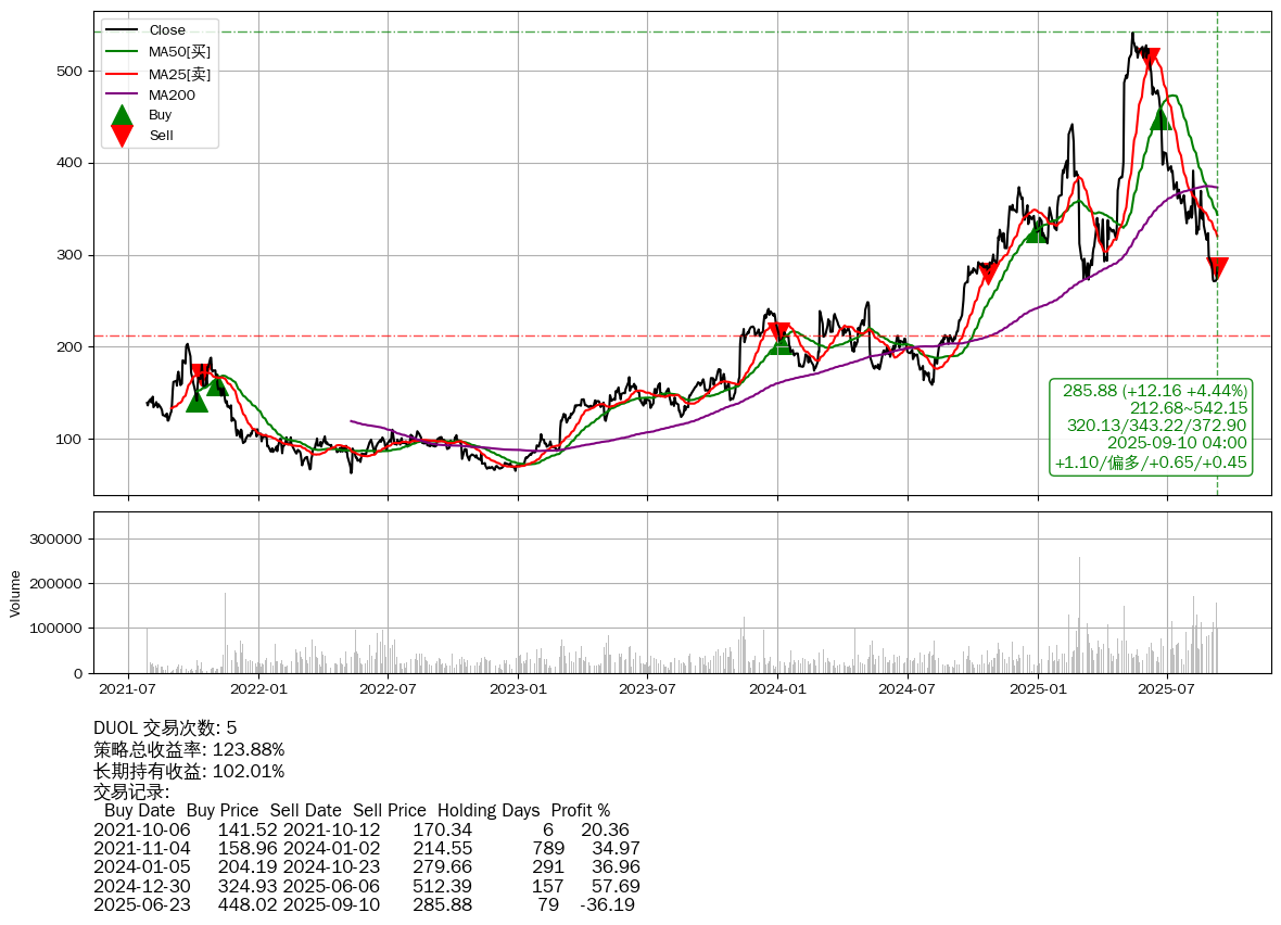 | 36 | DUOL | +123.88% | +102.01% | +21.87% | 5 | +1.10/偏多/+0.65/+0.45 | 2021-07-28~2025-09-10 |