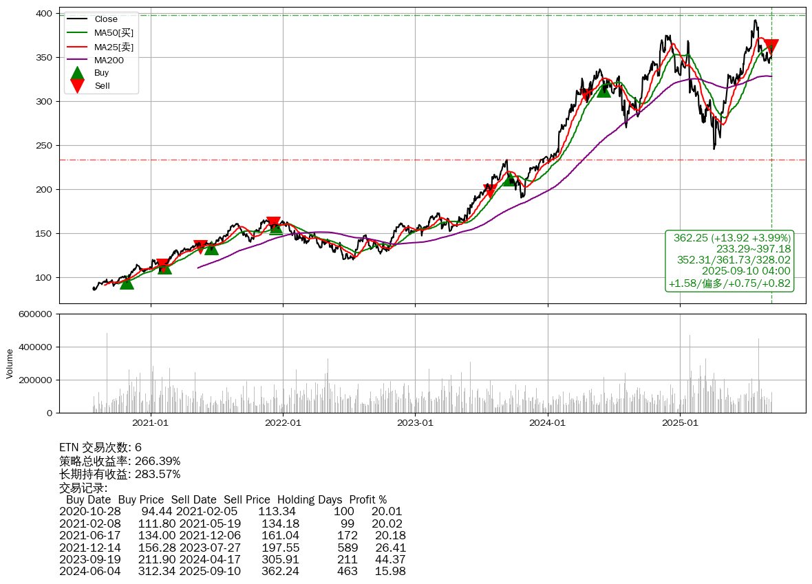 | 13 | ETN | +266.39% | +283.57% | -17.18% | 6 | +1.58/偏多/+0.75/+0.82 | 2020-07-27~2025-09-10 |