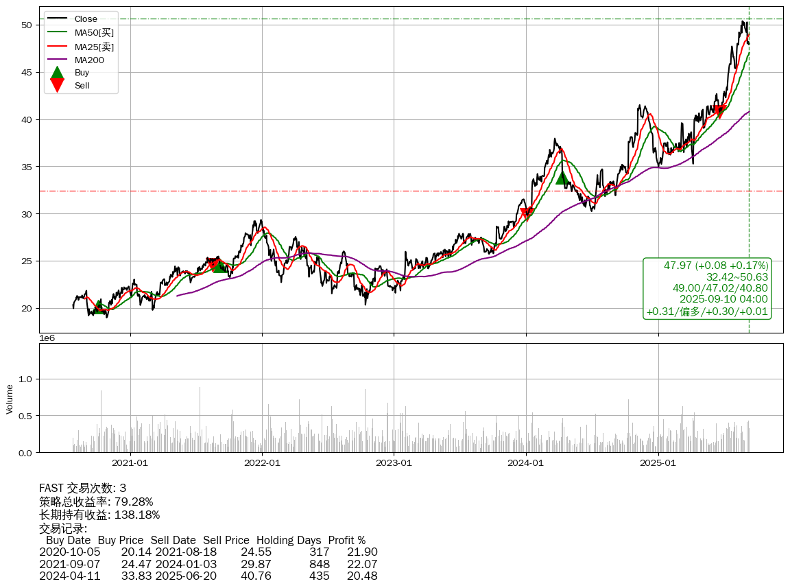 | 62 | FAST | +79.28% | +138.18% | -58.90% | 3 | +0.31/偏多/+0.30/+0.01 | 2020-07-27~2025-09-10 |