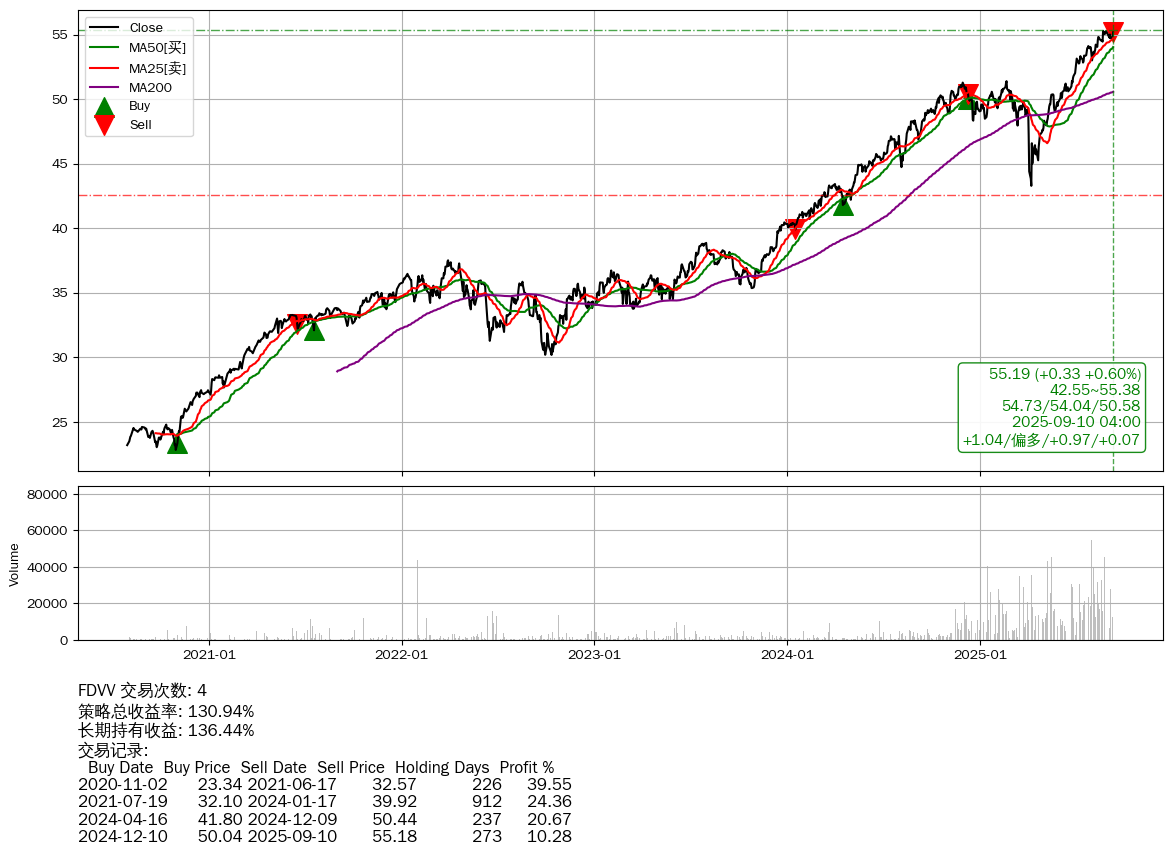 | 32 | FDVV | +130.94% | +136.44% | -5.50% | 4 | +1.04/偏多/+0.97/+0.07 | 2020-07-30~2025-09-10 |