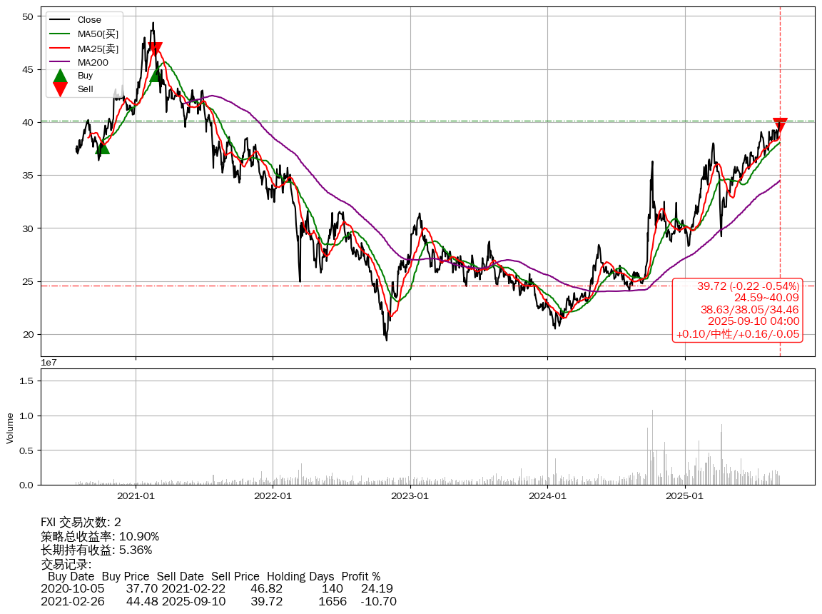 | 86 | ★FXI | +10.90% | +5.36% | +5.54% | 2 | +0.10/中性/+0.16/-0.05 | 2020-07-27~2025-09-10 |