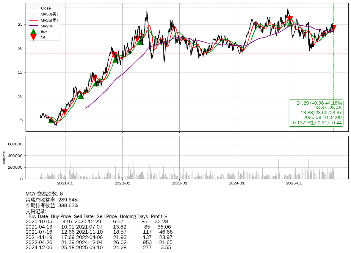 | 10 | MGY | +289.64% | +388.63% | -98.99% | 6 | +0.13/中性/-0.31/+0.44 | 2020-07-27~2025-09-10 |