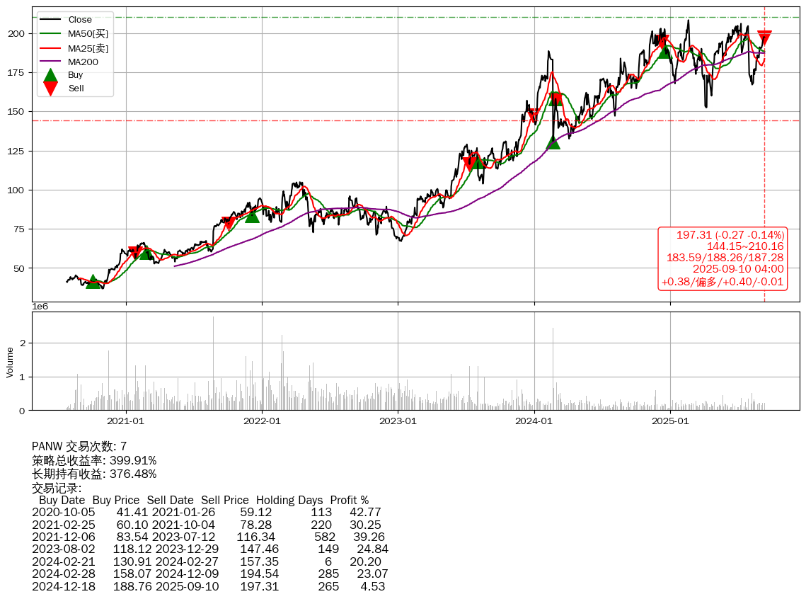 | 7 | PANW | +399.91% | +376.48% | +23.43% | 7 | +0.38/偏多/+0.40/-0.01 | 2020-07-27~2025-09-10 |
