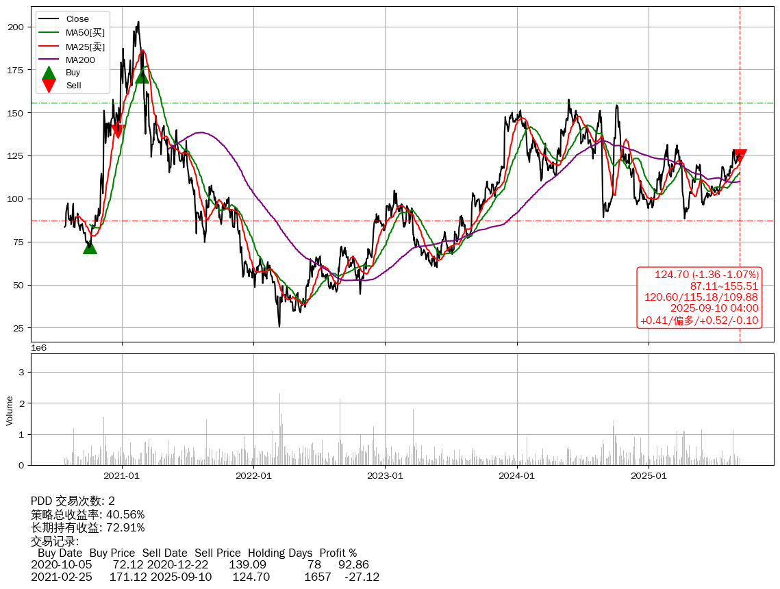 | 84 | PDD | +40.56% | +72.91% | -32.36% | 2 | +0.41/偏多/+0.52/-0.10 | 2020-07-27~2025-09-10 |