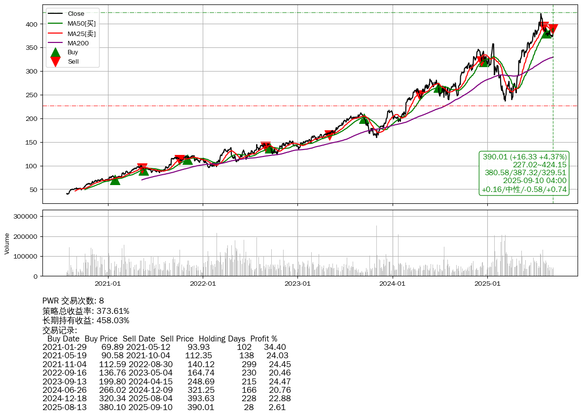 | 9 | PWR | +373.61% | +458.03% | -84.42% | 8 | +0.16/中性/-0.58/+0.74 | 2020-07-27~2025-09-10 |