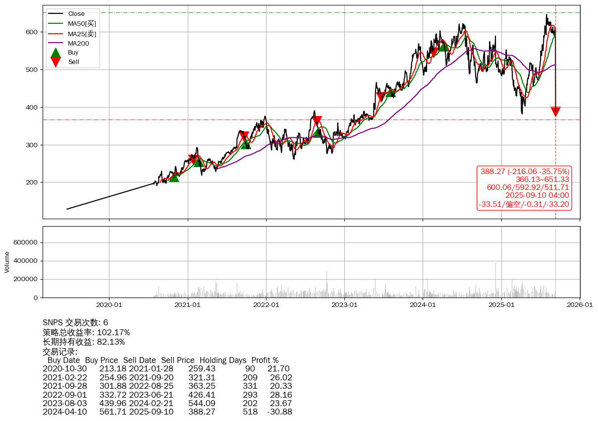 | 48 | SNPS | +102.17% | +82.13% | +20.04% | 6 | -33.51/偏空/-0.31/-33.20 | 2019-06-20~2025-09-10 |
