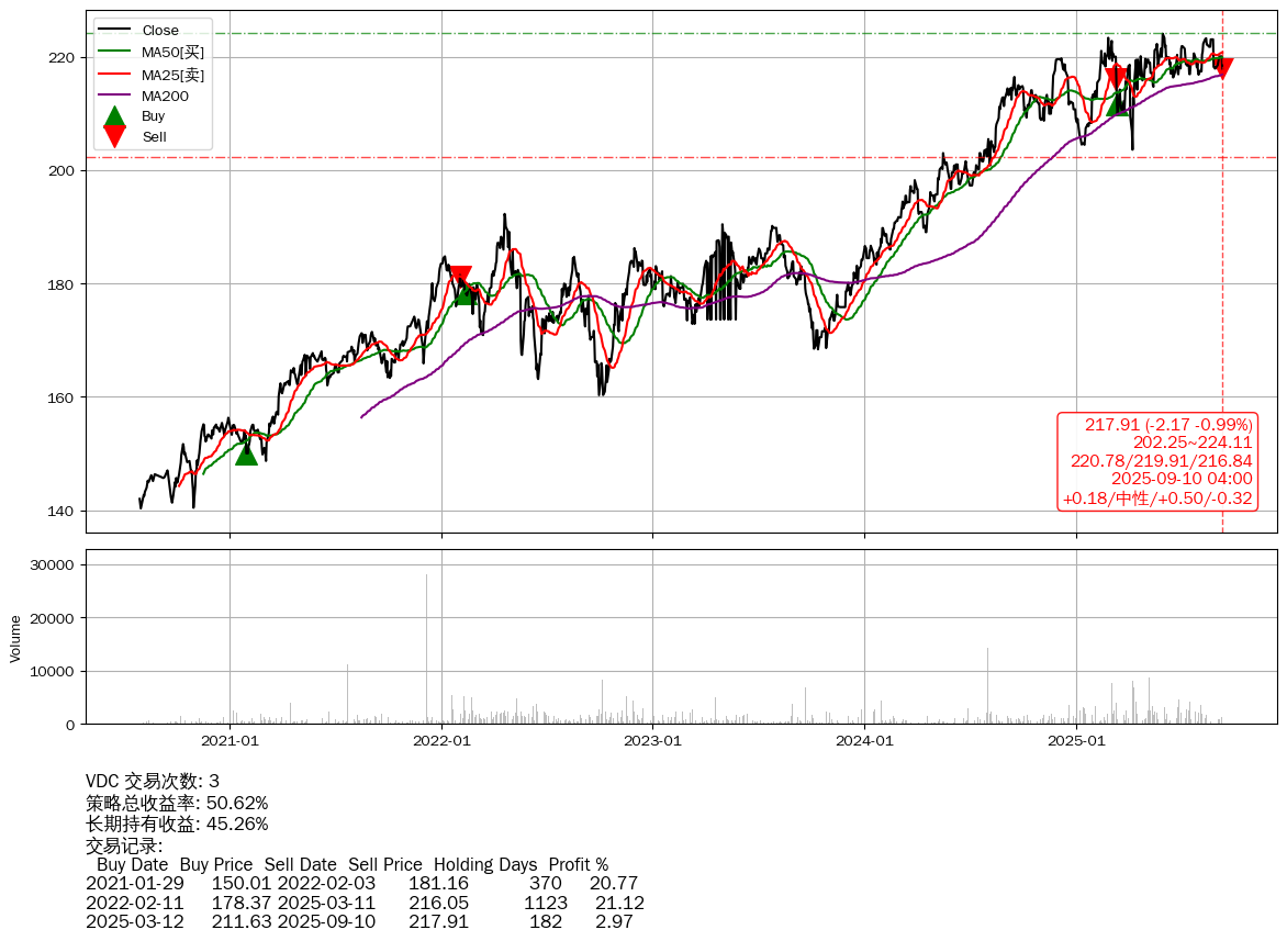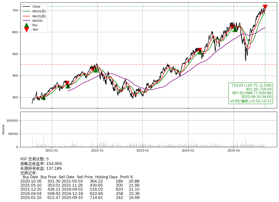 | 26 | ★VGT | +154.95% | +137.18% | +17.78% | 5 | +0.69/偏多/+0.52/+0.17 | 2020-07-27~2025-09-10 |