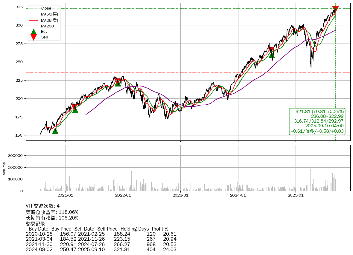 | 39 | ★VTI | +118.06% | +106.20% | +11.86% | 4 | +0.61/偏多/+0.58/+0.03 | 2020-07-27~2025-09-10 |