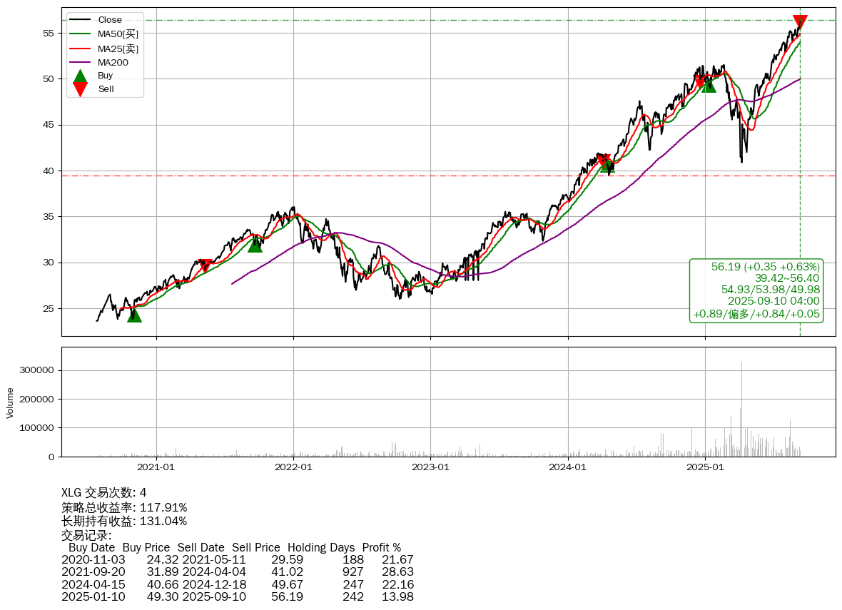| 40 | ★XLG | +117.91% | +131.04% | -13.13% | 4 | +0.89/偏多/+0.84/+0.05 | 2020-07-27~2025-09-10 |