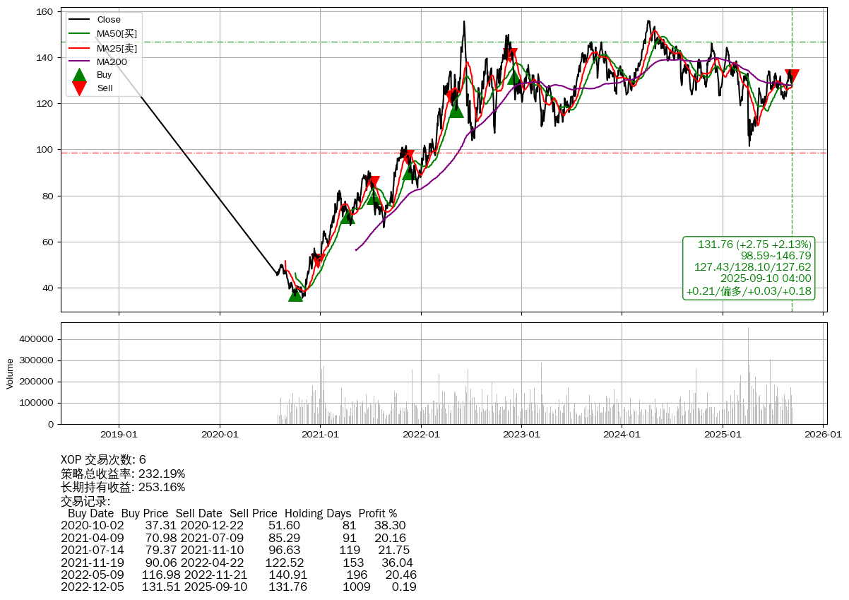 | 16 | XOP | +232.19% | +253.16% | -20.97% | 6 | +0.21/偏多/+0.03/+0.18 | 2018-10-08~2025-09-10 |