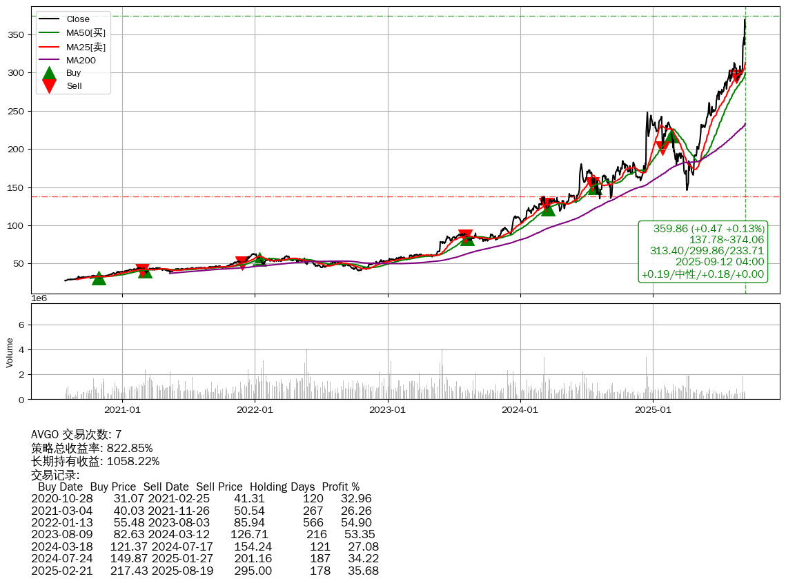 | 4 | ★AVGO | +822.85% | +1058.22% | -235.37% | 7 | +0.19/中性/+0.18/+0.00 | 2020-07-27~2025-09-12 |