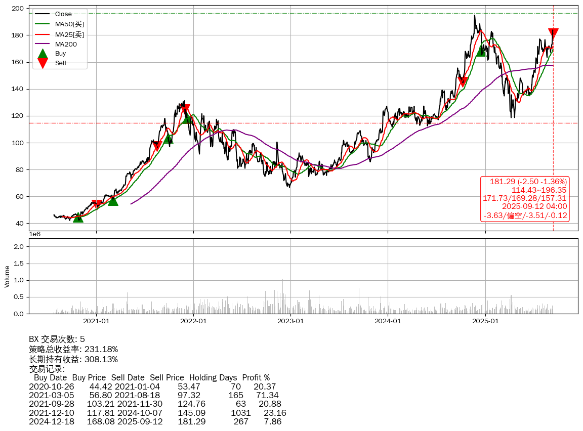 | 11 | BX | +231.18% | +308.13% | -76.95% | 5 | -3.63/偏空/-3.51/-0.12 | 2020-07-27~2025-09-12 |
