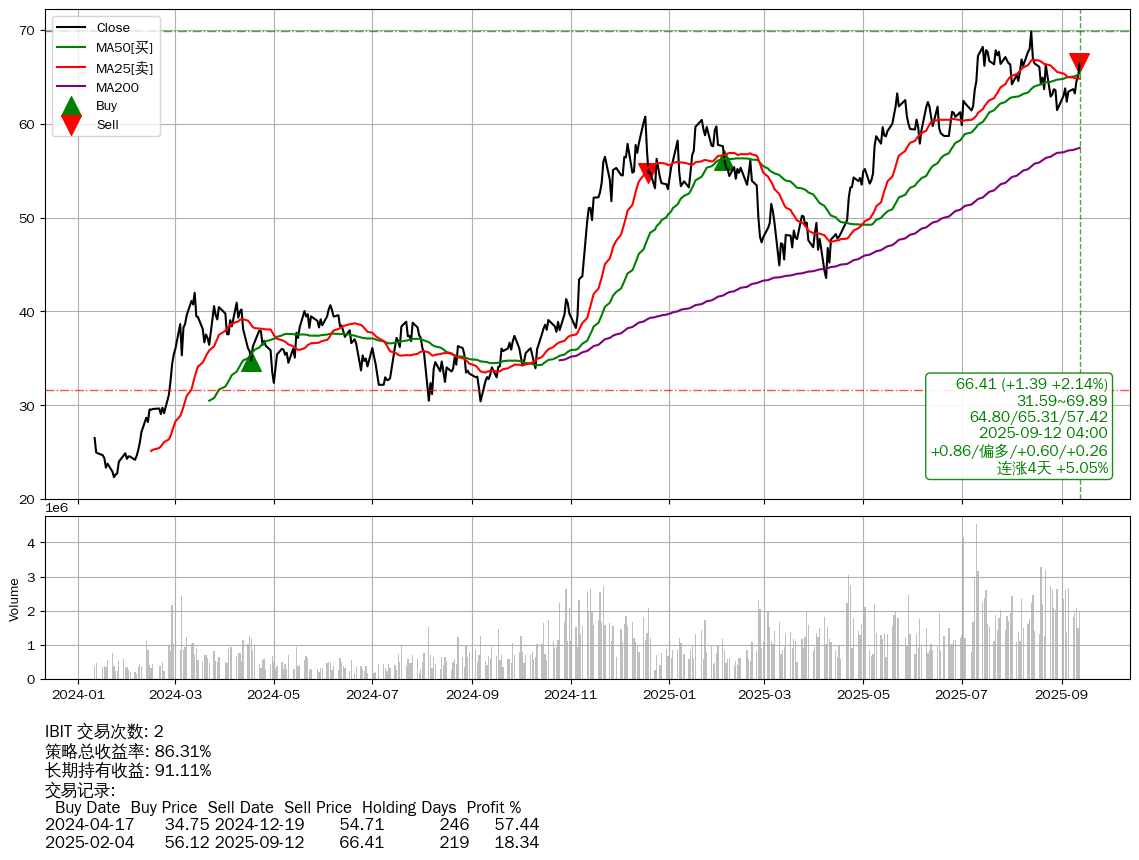 | IBIT | 2025-09-12 | 📈涨破 MA50 均线 | 📈连涨4天 +5.05% |