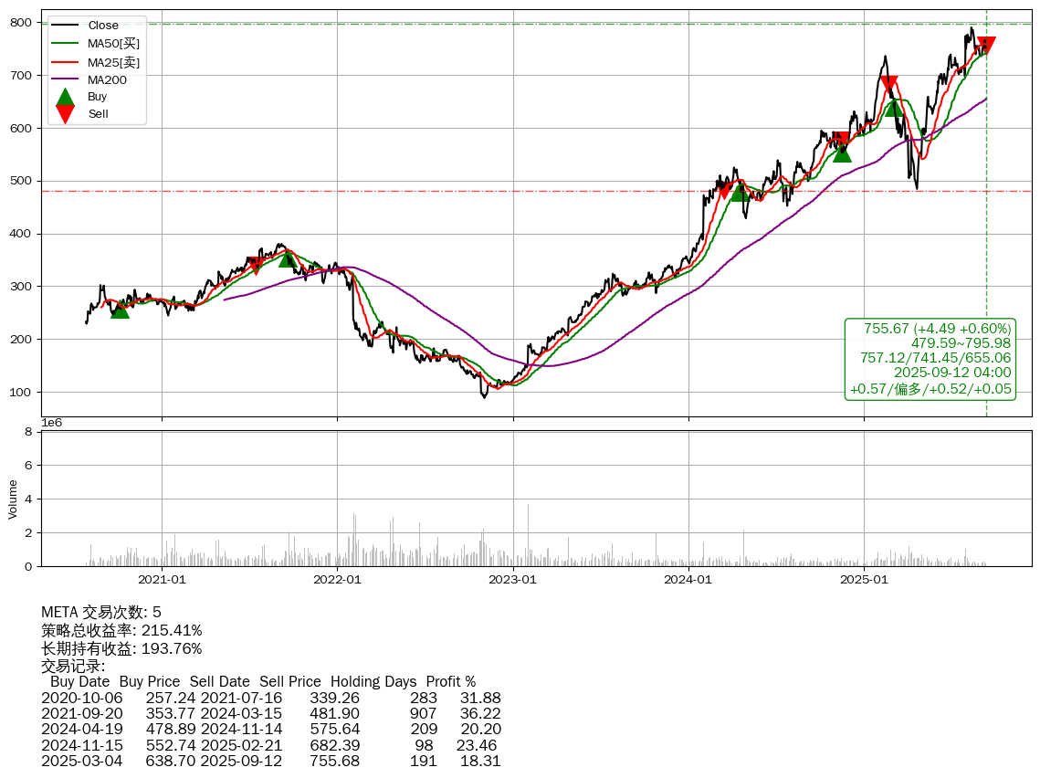 | 12 | ★META | +215.41% | +193.76% | +21.64% | 5 | +0.57/偏多/+0.52/+0.05 | 2020-07-27~2025-09-12 |