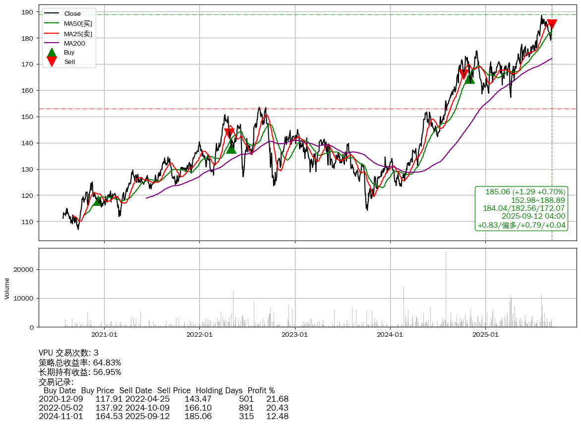 | 50 | ★VPU | +64.83% | +56.95% | +7.88% | 3 | +0.83/偏多/+0.79/+0.04 | 2020-07-27~2025-09-12 |