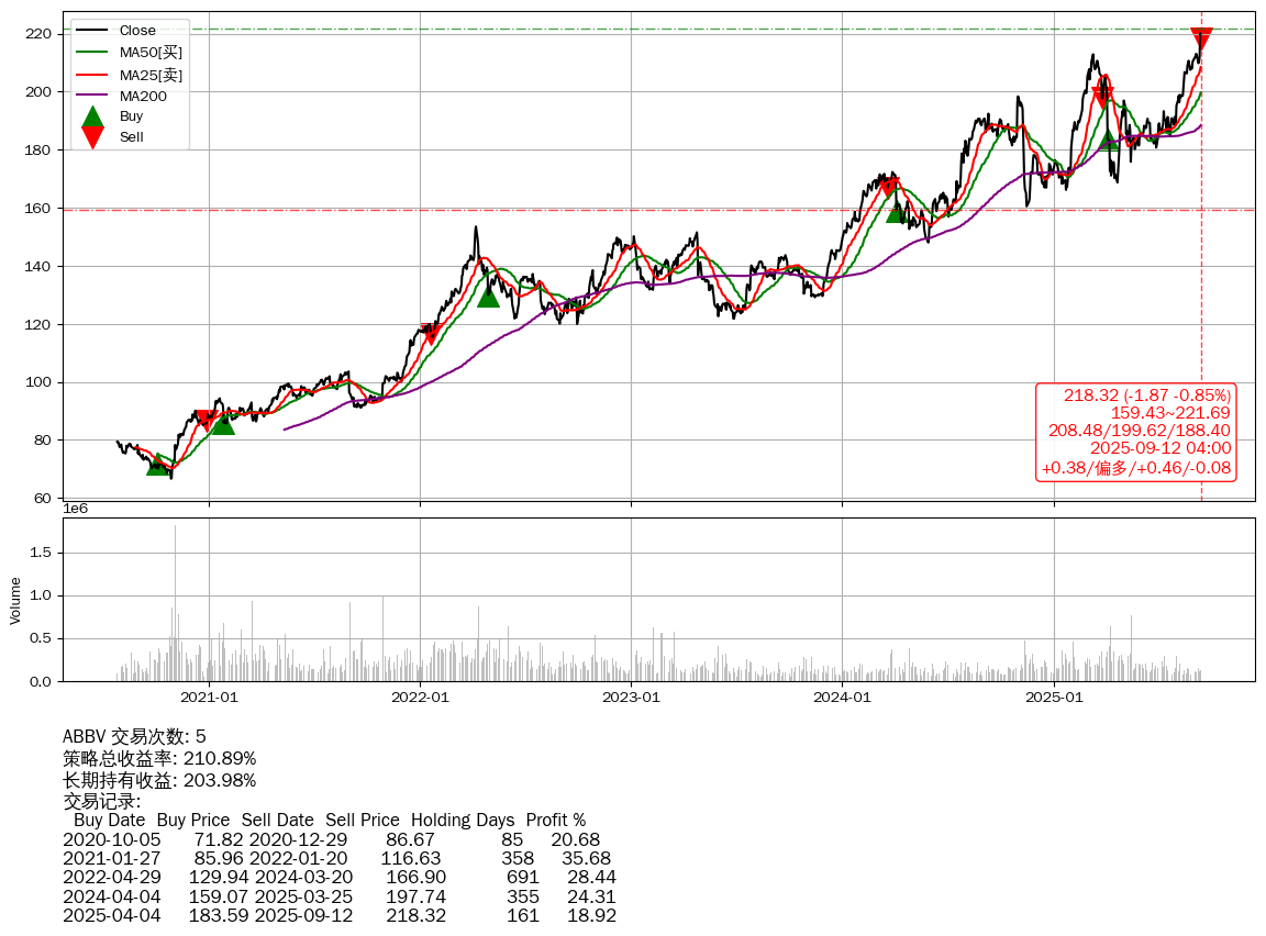 | 14 | ABBV | +210.89% | +203.98% | +6.91% | 5 | +0.38/偏多/+0.46/-0.08 | 2020-07-27~2025-09-12 |
