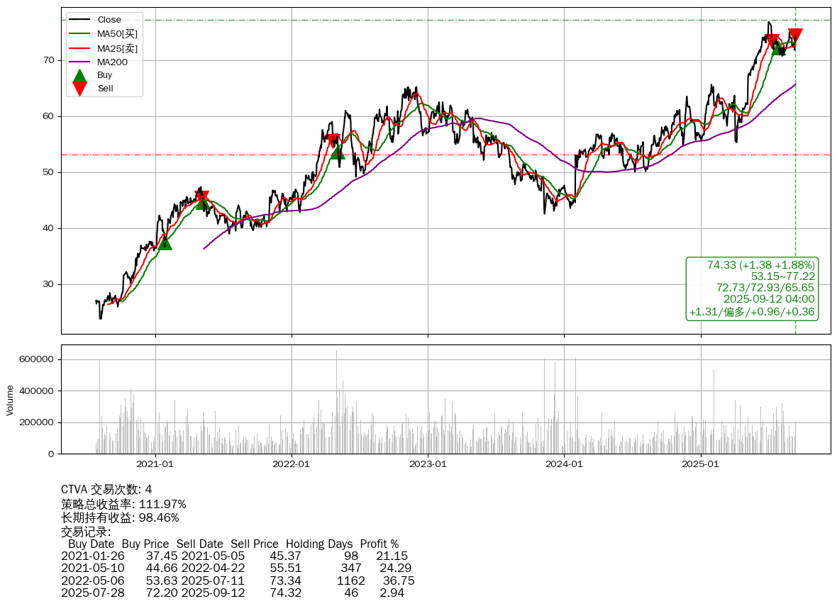 | 36 | CTVA | +111.97% | +98.46% | +13.50% | 4 | +1.31/偏多/+0.96/+0.36 | 2020-07-27~2025-09-12 |