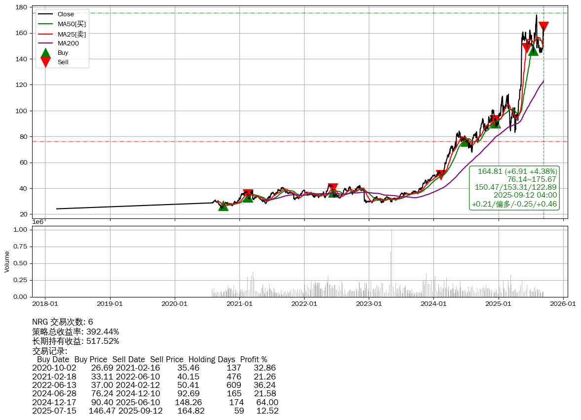 | 6 | ★NRG | +392.44% | +517.52% | -125.08% | 6 | +0.21/偏多/-0.25/+0.46 | 2018-03-07~2025-09-12 |