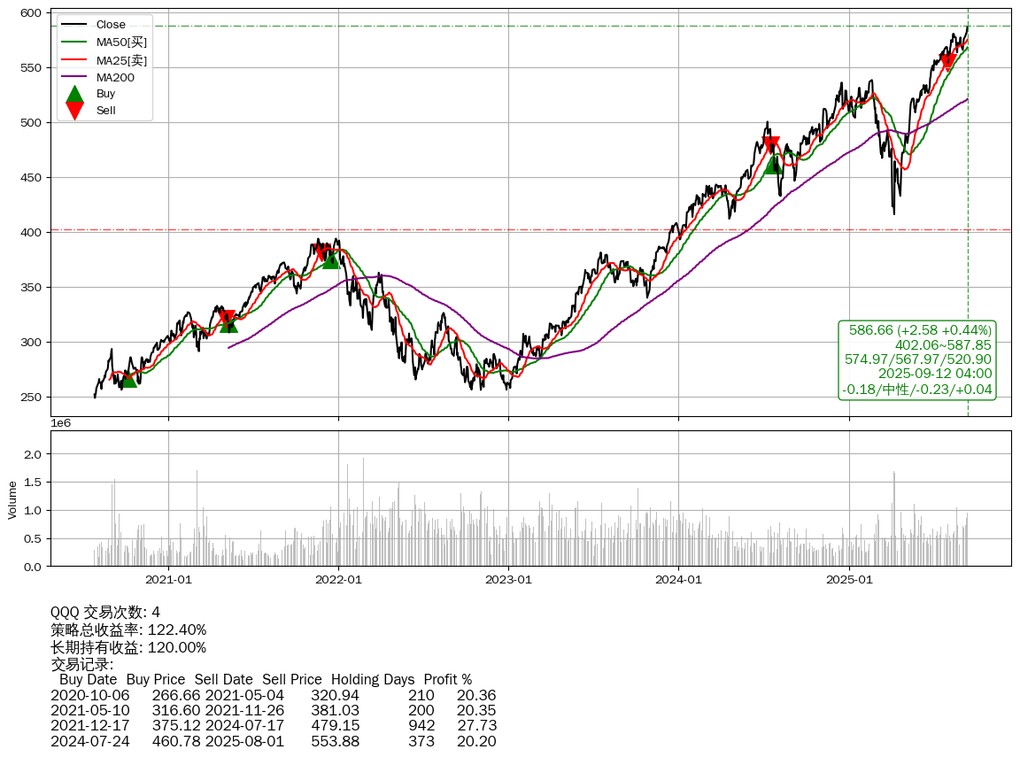 | 30 | ★QQQ | +122.40% | +120.00% | +2.39% | 4 | -0.18/中性/-0.23/+0.04 | 2020-07-27~2025-09-12 |