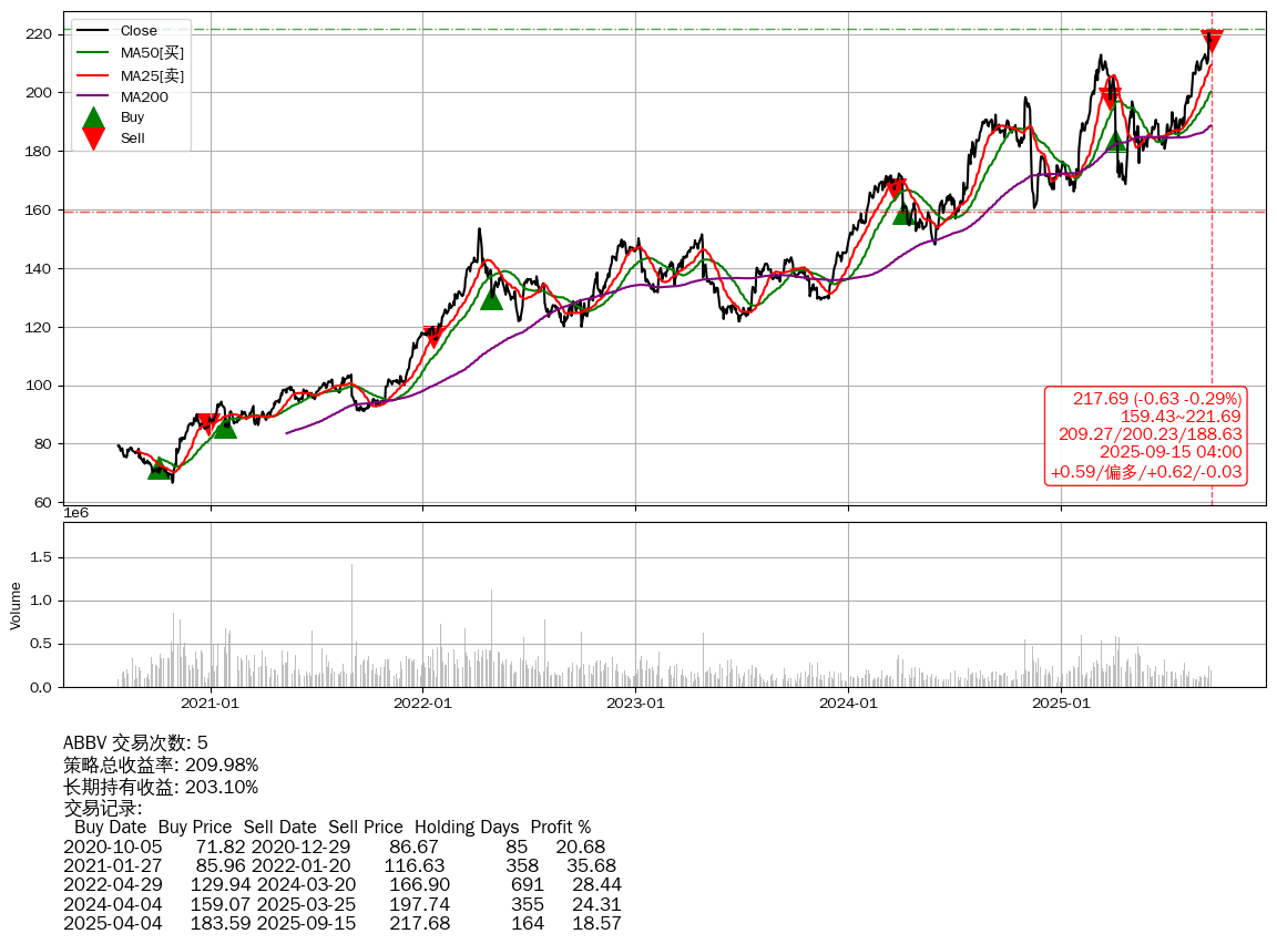 | 17 | ABBV | +209.98% | +203.10% | +6.88% | 5 | +0.59/偏多/+0.62/-0.03 | 2020-07-27~2025-09-15 |