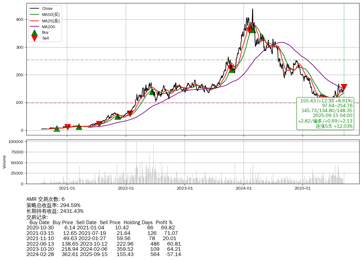 | 9 | AMR | +294.59% | +2431.43% | -2136.84% | 6 | +2.82/偏多/+0.69/+2.13 | 2020-07-27~2025-09-15 |