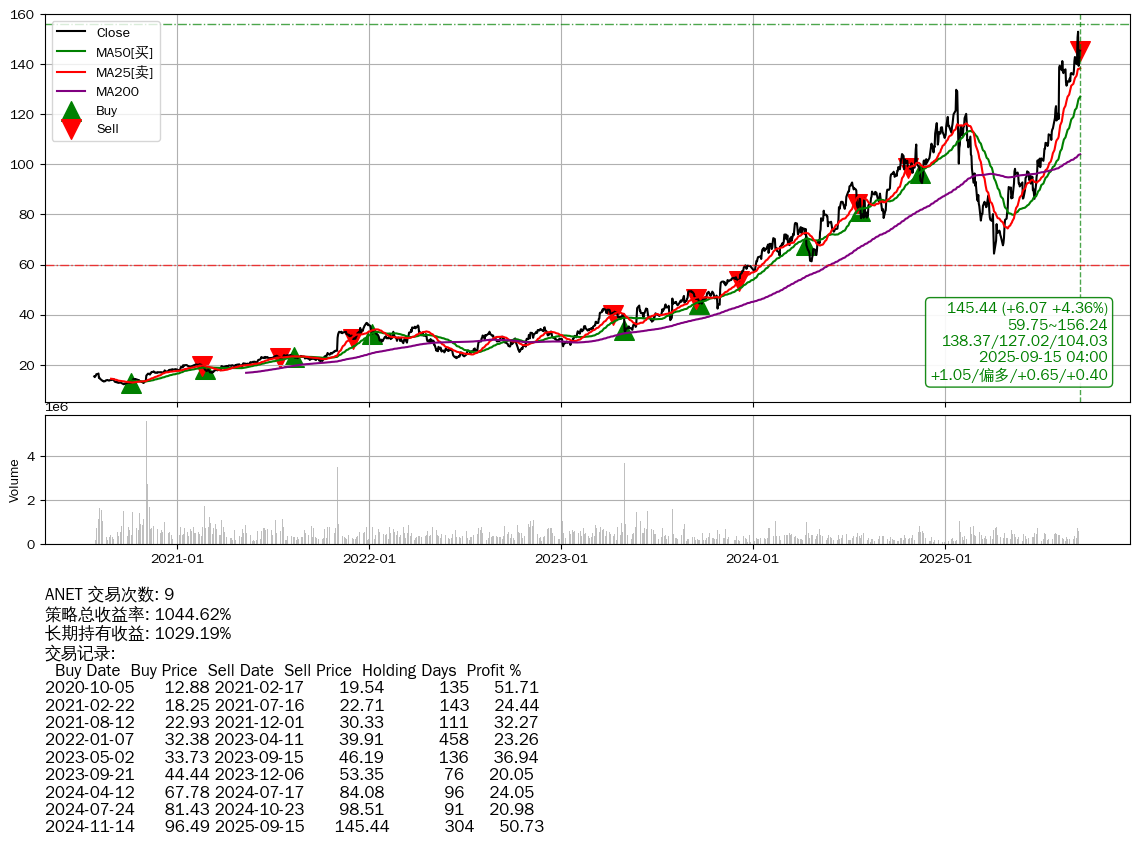 | 3 | ★ANET | +1044.62% | +1029.19% | +15.42% | 9 | +1.05/偏多/+0.65/+0.40 | 2020-07-27~2025-09-15 |