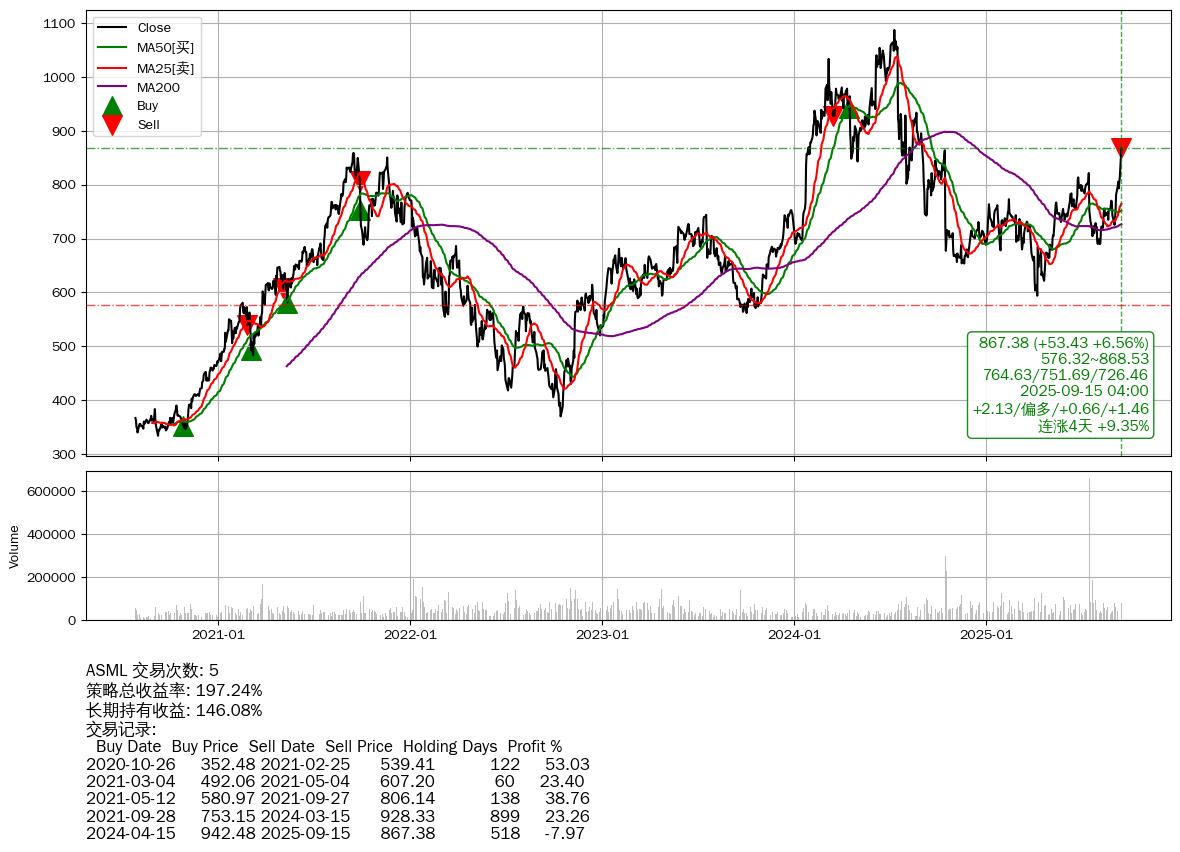 | 19 | ASML | +197.24% | +146.08% | +51.16% | 5 | +2.13/偏多/+0.66/+1.46 | 2020-07-27~2025-09-15 |