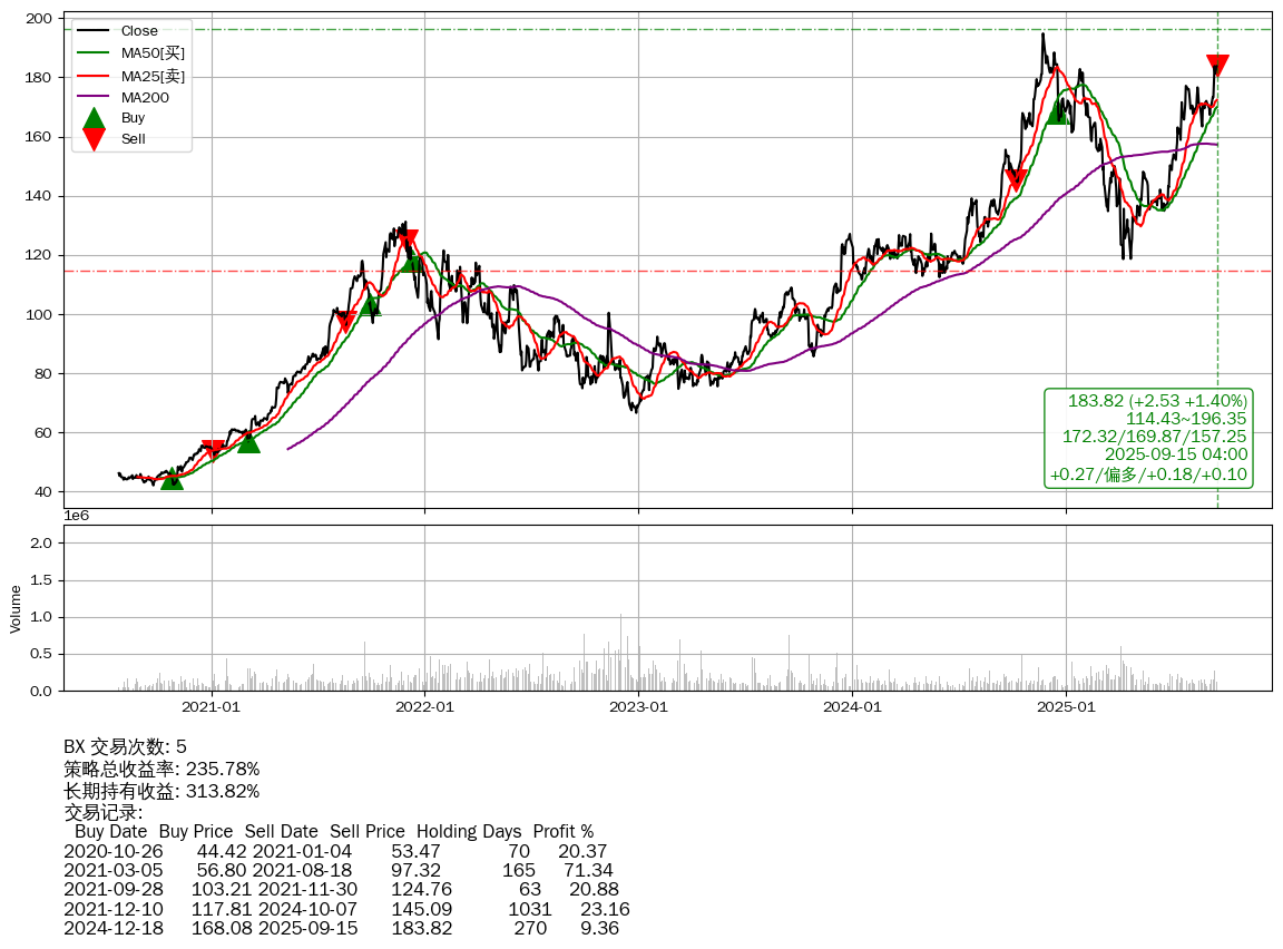 | 14 | BX | +235.78% | +313.82% | -78.04% | 5 | +0.27/偏多/+0.18/+0.10 | 2020-07-27~2025-09-15 |