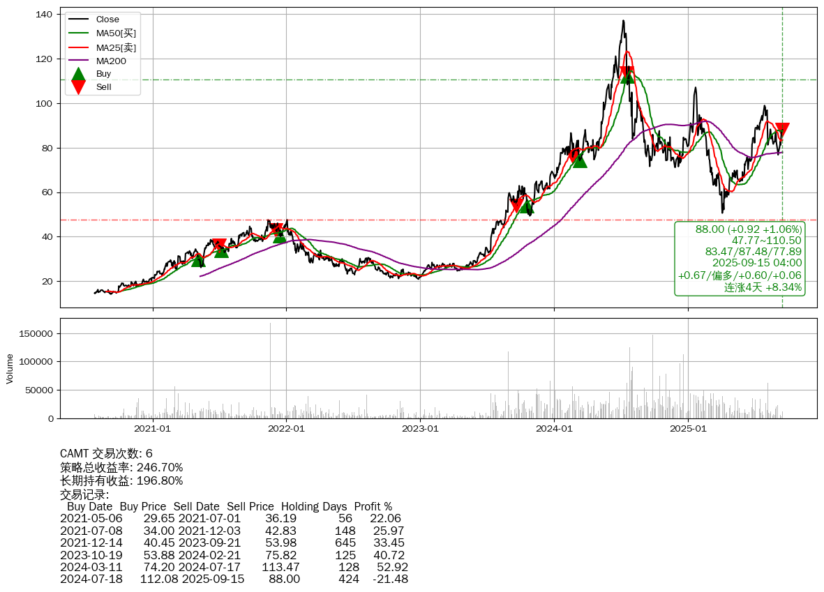 | 13 | CAMT | +246.70% | +196.80% | +49.91% | 6 | +0.67/偏多/+0.60/+0.06 | 2020-07-27~2025-09-15 |