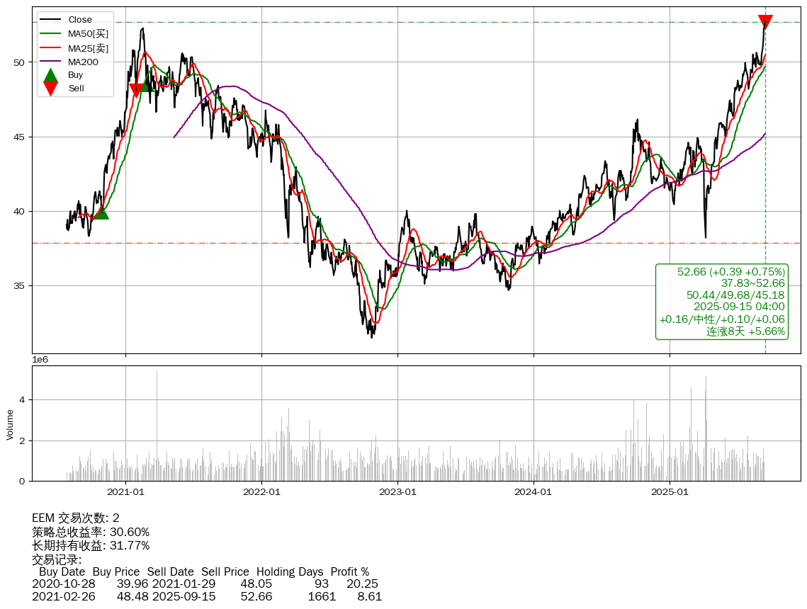 | 65 | ★EEM | +30.60% | +31.77% | -1.17% | 2 | +0.16/中性/+0.10/+0.06 | 2020-07-27~2025-09-15 |