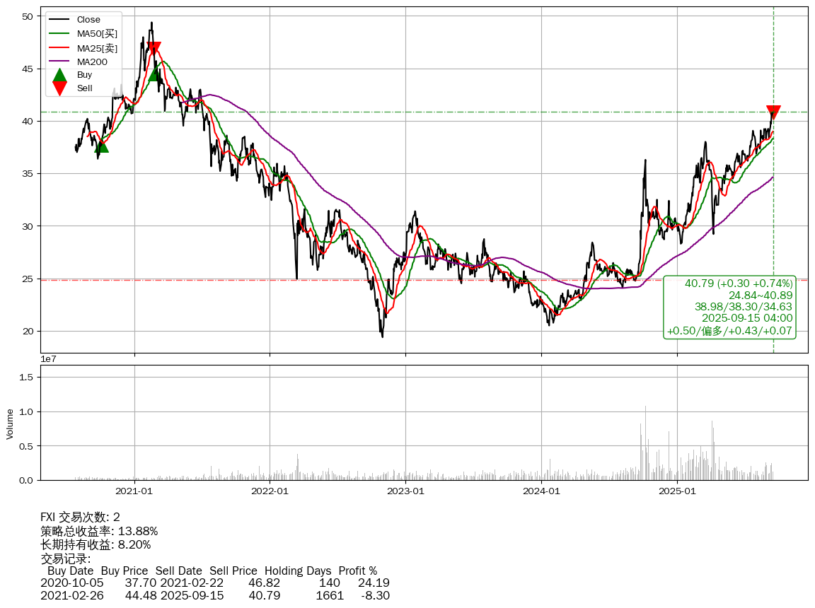 | 67 | ★FXI | +13.88% | +8.20% | +5.69% | 2 | +0.50/偏多/+0.43/+0.07 | 2020-07-27~2025-09-15 |