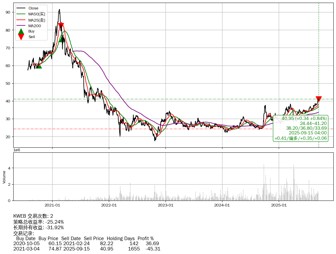 | 69 | ★KWEB | -25.24% | -31.92% | +6.68% | 2 | +0.41/偏多/+0.35/+0.06 | 2020-07-27~2025-09-15 |