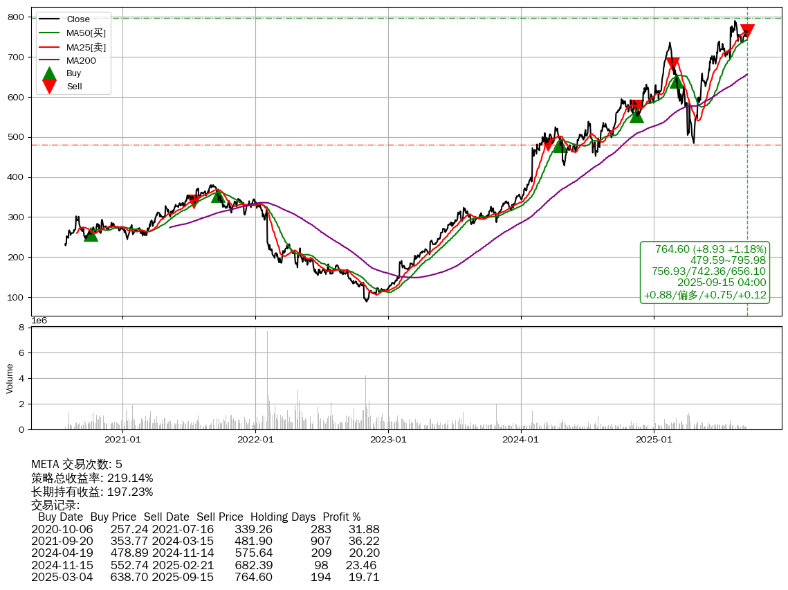 | 15 | ★META | +219.14% | +197.23% | +21.91% | 5 | +0.88/偏多/+0.75/+0.12 | 2020-07-27~2025-09-15 |