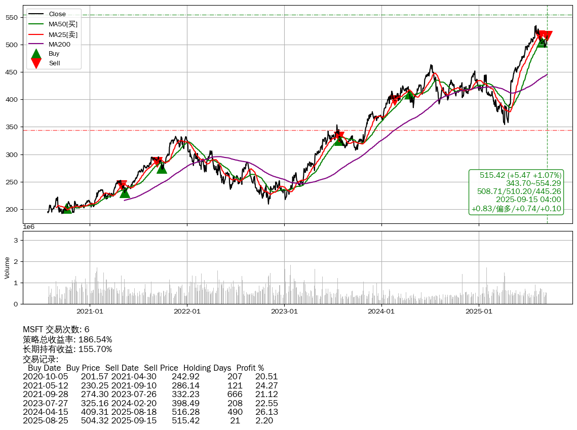 | 20 | ★MSFT | +186.54% | +155.70% | +30.84% | 6 | +0.83/偏多/+0.74/+0.10 | 2020-07-27~2025-09-15 |