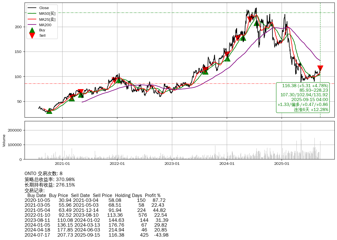 | 8 | ONTO | +370.98% | +276.15% | +94.83% | 8 | +1.33/偏多/+0.47/+0.86 | 2020-07-27~2025-09-15 |