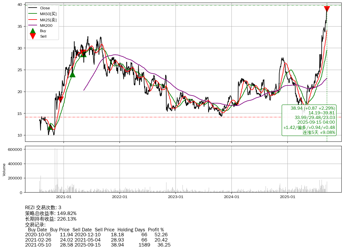 | 29 | REZI | +149.82% | +226.13% | -76.31% | 3 | +1.42/偏多/+0.94/+0.48 | 2020-07-27~2025-09-15 |