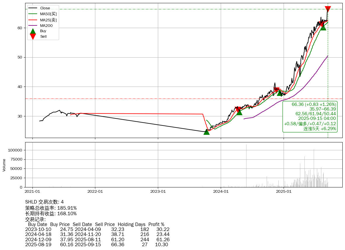 | 21 | ★SHLD | +185.91% | +168.10% | +17.81% | 4 | +0.58/偏多/+0.47/+0.12 | 2021-02-12~2025-09-15 |